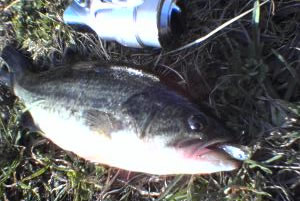 ゴロタシャローにワカサギかオイカワが群れてる。ジャスト・フラッシュトリックスサイズ。ゴロタにバスが潜んでいることを期待しフラトリを泳がせる。重くなって、あ?岩にひっかかった?と思ったらバス。モワ~んと水流起こして帰っていた。同じとこにもう一度。今度はラインが横に走った。釣れた!