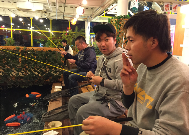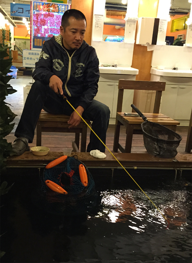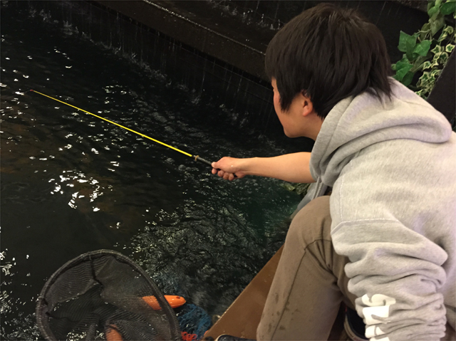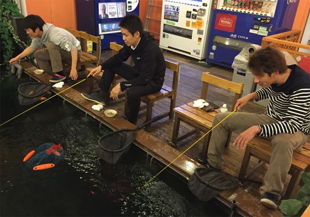 そんなわけで7名もいると、まーまー大変です。狭めの金魚池に3名の先行客がいたので、静かに競技を開始します(コイの時は貸し切りだったので騒げた)。