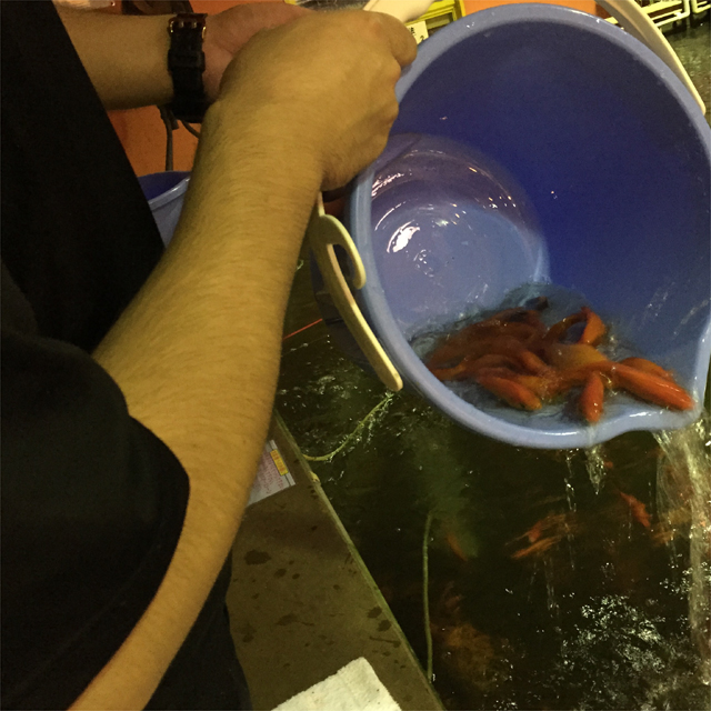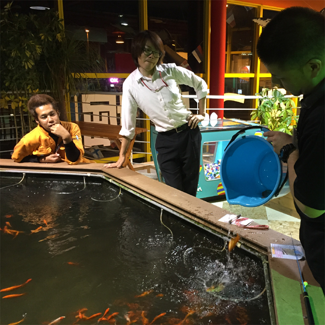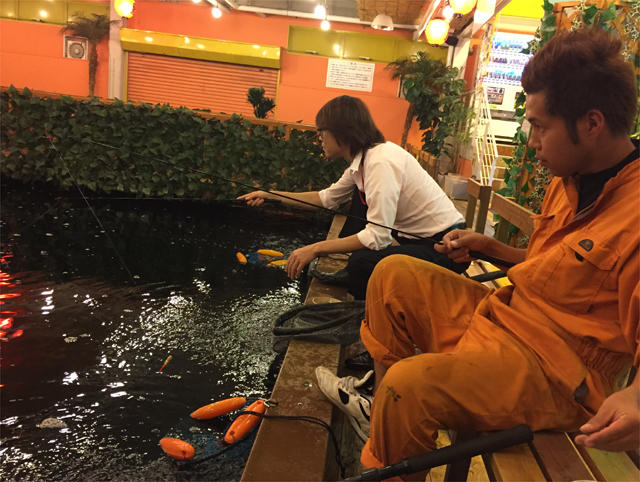 2Fにある「ファミリー金魚」っていう池。ボトムまで丸見えで完全サイトフィッシング場。こちらは全員初体験。タックルもショートロッドに玉ウキ。エサは練り餌でなく1mmくらいの玉状のやつ。