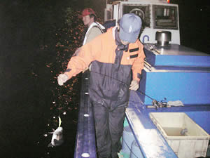 後半オレはリーダー切れちゃったり、スイベル無かったり、ヒットルアー無かったりのボロボロ状態。そんで、フィーバータイムは終了してバイトが遠い・・・。tonoはすっかりキャビンで爆睡。しょうさんは3匹ほど釣るも、オレはまともに使えるのが無くて駄目。ってか、もう2時過ぎてるんだけど、オヤジ何時終わるんだろう?ヤバイ・・・これはひょっとして体力勝負に持ち込まれている?挑戦状?