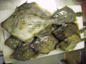 で、今回は1艇だけの出船。最後に船長に確認したらトップが23枚。俺らの反対側にいた人。Ushiと2人で「惜しい~」とか言ってた。が、家に帰ってHPみたら「トップ31枚」と嘘書いてた。しかも、写真に載ってるオバちゃんはオレの2つ隣に居たんだけど、たぶん5枚くらいしか釣ってない。