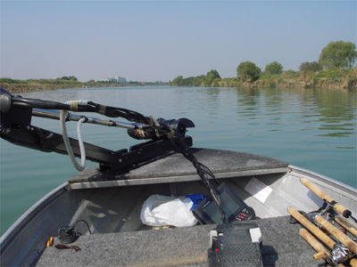 色々想像するわけですが、バスじゃ無いことは確か。残念ながら。幸い本流は7mの深さなので、下へ下へ走られてもエレキで追える。けど、一向に弱まらないのでドラグ閉め気味で止める。いやぁマジでロッドってこんなに曲がるのね~。4lbsってこんなに強いのね~って感心する。この前のロクマルのコイより数倍引くんだけど、一体正体はナニ?