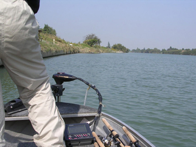 この川では非常にレアな垂直護岸ストレッチ(上図参照)。300mくらいかな?。ケンちゃんが交代って言うんで、エレキを踏む。前回、垂直にテキサス、斜めにクランク引いたけどナニも起こらなかった所。ってことで、せっかくの一人舞台なので壁スレスレをドラッギングしてみた。