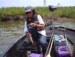 とりあえずボート屋さんオススメの上流側にある橋方面へ向かう。んが、走っても走っても景色が変わらない。琵琶湖の北をバスボートで走ってるときみたいだ。なので、オススメ場500m手前から釣り開始。とりあえずバズ流し。一日快晴の予報なんで、せめて朝イチだけでもって感じで景気よくバズで。佐武はトップを投げていたけど、バズ流しのスピードに耐えられずクランクかなんか投げていた。で、何も起こらず。岸沿いが思いの外プアなのよね。岸にはゴージャスなカバーがあるんだけど、水位が足りない気が。岸からちょっと離れると急なブレイク。魚探にはボラっぽい映像が盛りだくさん。でも、その上の浅いところは生物の気配が無い感じ。
