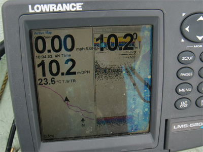 釣行前の情報に固執しちゃったことと、サーモクラン的な3~4mに映る帯にすっかり騙された感じでした。ってか、やっぱりベイト絡みの釣りにはHONDEXがいいのかなーって思う今日この頃。