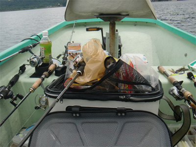 シートのクッションが雨で濡れて、パンツまで染みちゃって、ツーケー半濡れで超カユイ!またかよ!。クッションが無いと今度はシートが硬過ぎで尻骨がイタイ。更に雨が上がって長靴がウザイ。ってことで、一旦ボート屋に戻って、フットターボ用に買っておいた円形クッションとサンダルを準備。