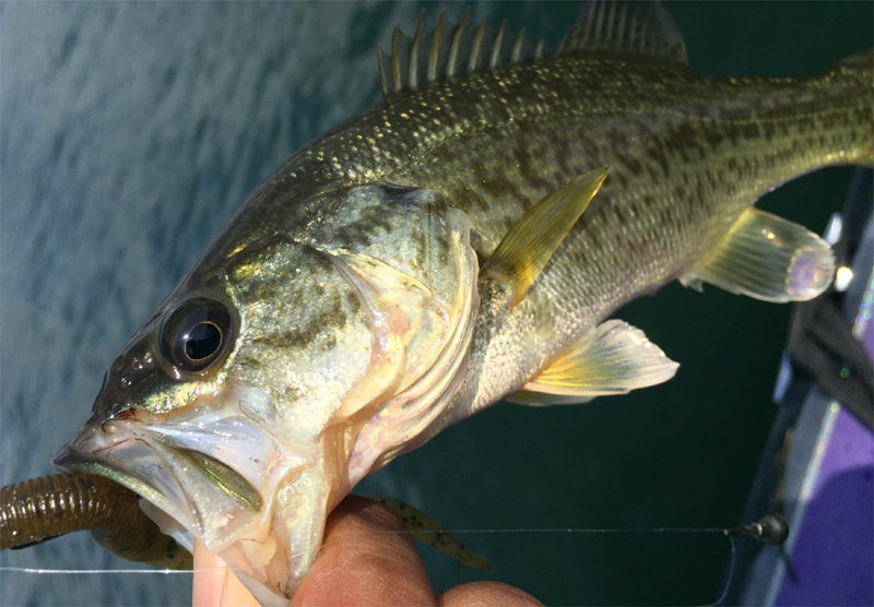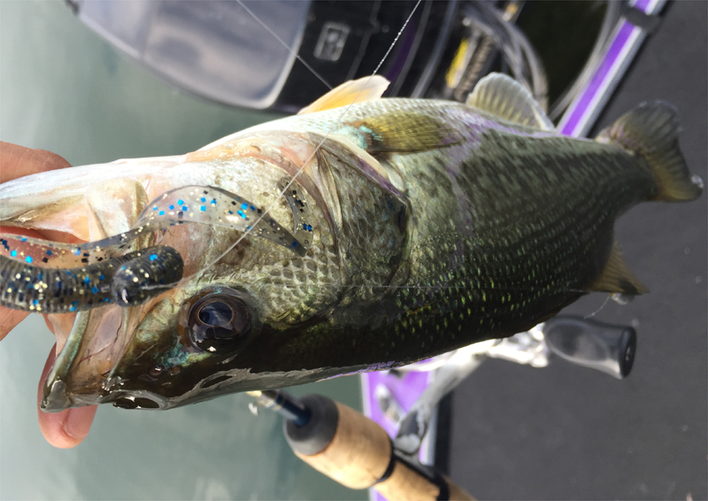 これ書いているの9日後なので記憶があやふやでありますが。朝イチの風がない時間帯は4mくらいのライトリグタイム。とりあえずバスの顔を見れる的な釣りでしょうか。ZOOMカーリーのダウンショットを投入し、お友達サイズがポロポロ釣れましたぁ。
