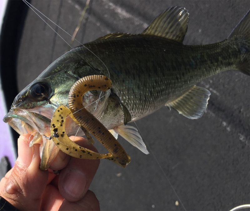 キャロライナリグにしてドラッギング。んで、いろんなワームを試してみたんです。その結果、カーリー系がめっちゃ高反応。