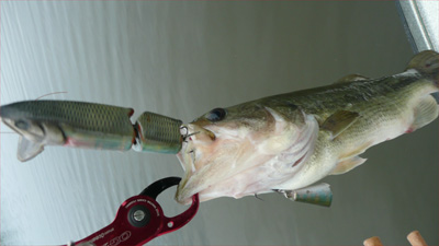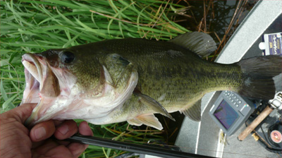 ヒットしたけど、ちょいと肌と顔色が悪いバス。次のキャストではスーパービッグバイト!ロッドを立てる間もなく凄いスピードでのされて10lbsラインはプッツリ。まぁまぁ良い感じに育てたIK-400ツーコンのロストorz。レンギョか巨ゴイか存じませんが、謎の魚さんゴメンナサイ。