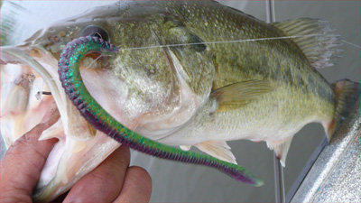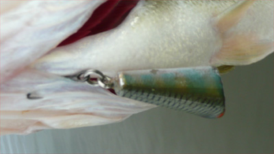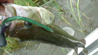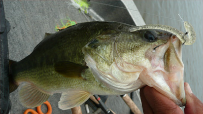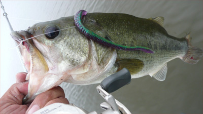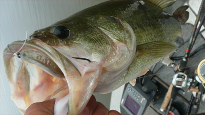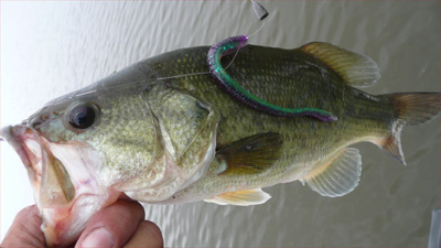 で、2.7だか3.5gだか不明ながらも、いちばん小さいバレットシンカーをスタリオンにセット。ワームはこの際だからシャレでスライダー4インチ。っても、このワームだとシンカーが軽くてもフォールは速いんだけども、とりあえず何の気無しに投げてみたら一発!