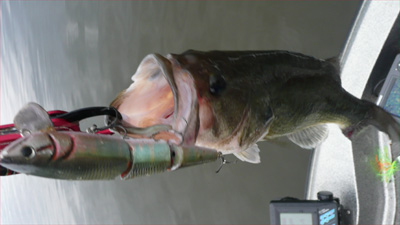 ってか、リビットもバズも割とスピードが速いんだけども、トップに出る事は出るんで遅いトップだらもっと釣れちゃう?ってことで、昔作った自作ビッグベイト投入。一投目で出ました!出たというか、モワっとなって勝手に釣れてた感じですが、今ツアーMAXに嬉しい1匹!