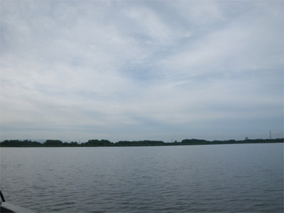 昨日と違って無風の湖面。沖の釣りもやりやすい。5mラインにポツリとある2.7mの小さい山へ。魚探反応はいい感じ。フットボールとキャロで探ったけどノーバイティング。ってか暑いし風ないし流れも無いし、これは専門用語でいうところの「タフコンディション」ってやつ?
