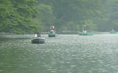 そんなわけで7時過ぎにボート屋到着してビックリ!クルマが5~6台並んでた。かなり釣れるようになったみたいです。ボート屋さんと話をしてる間も、桟橋付近にはオイカワの群れがモンモンしてて数匹のバスが水深30cmの桟橋周りに居たりしてとっても良い感じ!