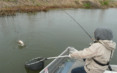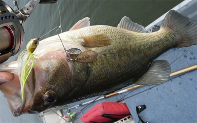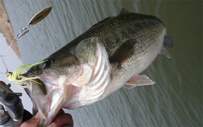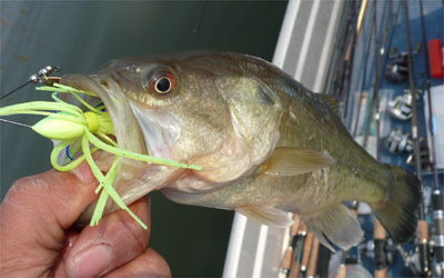 で、前日夕方、トロ丸駐艇場まで行って、スピナーベイト箱、ランディングネット、ネガカリ回収棒などを持ってきた。これで準備万端です。今年はデスカバリー・スピナーベイト・イヤーなので、久々にスピナーベイトを朝から投げる。ボート屋でてすぐ横からスタート。そんでいきなり朝からプチ連発!