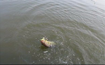 ここ何匹いるんだ?っておもって、ボートを岸に差したままオレも投げたらピックアップ直前にチェイス!スゲーここ!ってか巣か?ってくらい同じ所から出てきてビックリ。