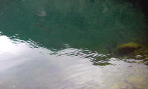 さっそくi社の酔い止め薬みたいな名前のワームのノーシンカー投げながら歩く。と、ワンド角には大小20匹くらいの群れがボケーっと浮いてた。さっき通したハズだけど、こいつらガン無視?