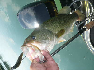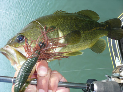 昨日ボスが釣ったメインチャネル部にスタッガーテキサスを投げる。チャネルとウィードの位置を確認するためあちこちにファンキャスト。で、思いのほか深いところでウィードに絡まった。