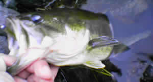 マイウォーターの岬でスワンプ練習するもすぐに飽きて得意のリーパー1gジグヘッドにチェンジ。ブレイク途中、推定4mのウィードに乗ってて待っていたら、なにげに釣れていた。バイトはまったくわからず。