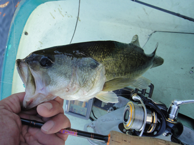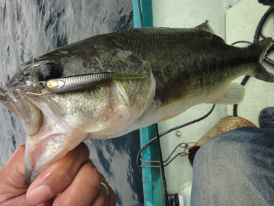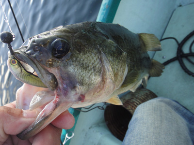 この前買ったDVDムックで知った「重めのJHでボトムをズル引く」って技。なるほど。去年の榛名湖でも11月くらいにそれで何本か釣ったので、もしかして効くかも。ってことで、重めのJHでズル引き。