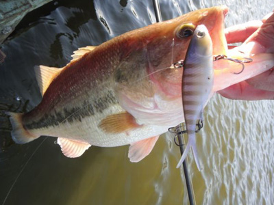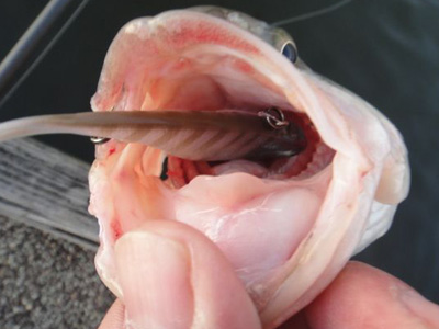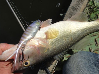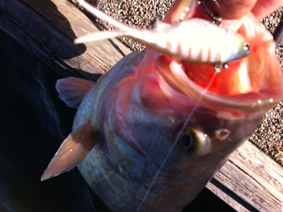 ってことで、ボトムのズル引きにトライ。で、なんとか1匹釣れました。リアフック1本外掛かり。