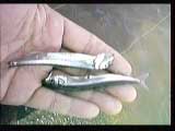 半ば諦めつつ、岩が点在している岬先端を1/32ジグヘッド+アライブシャッドを投げてツイッチで誘ってみる。そしたら、背中が黒いベイトフィッシュがいっぱい追ってくるではないの!っつーことはバスもいるかも!真剣にキャストを繰り返したらヒット!チョーショートバイトを見事にゲット!したら....ワカサギ(爆)しかも口にフッキングしている。気を取り直してキャストし直せばまたまたフィーッシュ!ワカサギ!今度はスレ。可愛そうなのでそのままライブベイトとしてジグヘッドに刺して、キャスト!フィーッシュ!ワカサギ!これじゃ「ワカサギのトモ釣り」じゃん。なんなの一体?なんでこんな浅場でワカサギがイレグイなんだ?