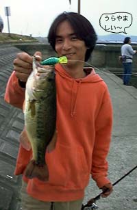 さっきのよりちょっとだけ大きいぞ。はっはっは。リアフックしか掛かっていないのに、ファイトのシーンとか水面で暴れるとこをバシバシ撮影される。今バレても一匹にカウントしてね、って感じ(笑)。ちょっと恐いのでロッドをグリグリしてフロントフックも掛けてやって、さー好きなだけ撮影してちょんまげ。ランディング後、今度は俺の釣り用にデジカメでパチリ。いやぁ嬉しいなー。