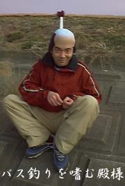 M氏が撮影の為カメラを持ってやってくる。あ、そーいえば今日、コンタクト(レンズ)するの忘れていたな、ってことでメガネを外して堤防の上に置いた。んで、バスを抜き上げカメラに向かってハイポーズーーなんてやってたら、、、、バスの尻尾フリフリ攻撃でメガネが飛ばされた。しかも湖側に、、、、あぁーーー。