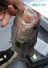 この2匹とも1mちょっとのストラクチャーから湧いてきたようなんで、対岸のシャローに沈んでいる木に、またまたヤフーのノーシンカーをキャスト。んで、同じようにまた追ってきた。「食え食え食え」とゆっくりフォールさせたらまたパク!って感じでようやく一匹目ゲット。35cmくらいの立派な背中をしたバスだった。亀山初バス!