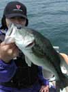 でも、釣り方がわからん。9インチデッドリンガーのテキサスぶち込み?サスペンドしてるならまだしも、底ベタだからなぁ。ボートを真上に乗せるとバスが逃げるし、かといって遠くからキャストしてもバスの目の前へ落とす術を知らないし。どうしたらいいのか?どうすることもできないのでコイツ等は見逃してやろう!更にボートを岸際へ寄せて波打ち際を見てみる。と、ポツポツならが居るよナイスサイズが。石の横に寄り添ってたりしてるじゃん。これなら釣れるかも!エレキを1にしてゆっくり流す。あ、いたいた緑色のアイツを発見!BS5のスプリットをアイツの目の前にそっとキャスト。「パク!」おー食った食った!バイトシーンが見えちゃったので、ちょっと焦って強めにアワせたらすっぽ抜け!ガーン。