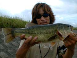 Tacoもスピニングをやめベイトロッドを持ってきた。アシ周りフィッシングを楽しむ。で、ふと水面に目をやると木箱のようなモノが沈んでいる。こーゆーとこに居るんだよねーとかいいつつ、2人同時に木箱の左右にジグをポチャリ。んで、オレにヒット!Tacoは根がかり。ウヒヒ気分いーなー。腕の違いではなく竿の値段の違いと言うことにしておこう。