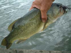 ゲナーラのゴロタ帯もこの増水でバスが集まっているかもしれない。ゲナーラを通りかかった時Tacoが「ここやります?」と言う。家を出る前はかなりやりたかったとこだけど、なんか眠いし、とりあえず朝釣れたし、どーでもいいやな感じに。「うーんどうすっかねぇ」とかいいつつ、ちょっとだけやることにしクルマを止めた。デンゲキにはフットボールが結んである。さすがにこの超ゴロタエリアでキャストしたら根がかりロストは避けられないよな。クランクとかスピナーベイトが王道だ。けど、結ぶの面倒だなぁ。とかいろいろ心の中で思いつつ、とりあえずフットボールのまま護岸へ降りる。水門の中ならねがから無いだろうと、定番の4角にジグをポチャリ。バス居ネーか。最後に内側の壁にジグを泳がせるとフォール中「コン」とバイト。ギルバイトだよーとか言ってみたものの、ジグが着底する感じが無い。デンゲキ向こうアワセをかますとヒット!お!居るンじゃん。小ぶりながらきれいなバス。写真を撮ってリリース。