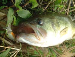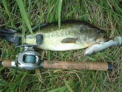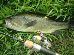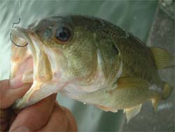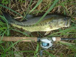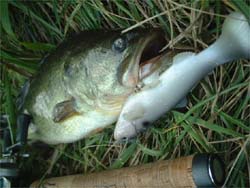 バンビーゴーブリッジ南側の水門へ。ここはディープがベリーニアなせいか、ベイトッ気が多い。ボラじゃなくて、ワカサギっぽいのも居た。水門をツネっていると、バスのボイル音がした。さっきから各種フィッシュが水面を騒がせているが、今のは明らかにバスのボイルだった(気がする)。また起きないかな~と待つがダメ。じゃ移動しよっと、と思って土手を登っているときボイルが起こる。3センチくらいの小魚数匹を激しく追っている。護岸まで追いつめて来た。そこへとりあえずスピニング常を直撃させたら食った。すげーなバスって。あんなに派手に本物を追ってて、こんな小さいワームを一瞬で見つけて食うんだもんな。しかも、3lbにナス1号ツネだからフォールもかなり速いんだけどね。 つーことで3匹目は小さいバスだったけど釣れ方が良かった。