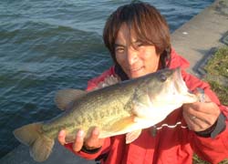 4lbなので非常に怖いんだけど、この前の小野さんのを見ているのでオレなりに落ち着いて対処。一瞬水面に上がってきたとき見えた魚体からして40クラス。でも慌てない慌てない。自分にいいきかせる。勝手に暴れてくださーい。はいはい。あーでもちょっと怖い。はいつくばってランディング体勢。背中をつかめるサイズじゃないので横を向いたときに一気に腹の下へ手を突っ込み陸上へ掬い上げ。決まった。ちょっとバスがかわいそうだったけど。