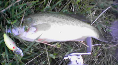 同行者になんとか1匹釣ってもらいたく、手堅く最後はLONG護岸へ。一番おいしいスポットを教えなんとか1匹ゲッツ!おめでとう。さて、オレも釣るぞ。1/2ozジグでボトムをこづくとヒット!でもばれた。最終兵器CCプレデター登場。おろしたて新品!でも、わずか2キャストで殉職。凹んだのでプレデターの半額で買えるモデルA登場。ボトムノックさせまくり。ネガかっても、8割の確率で結び目近くで切れるんで、浮力が強いクランクは回収も簡単。