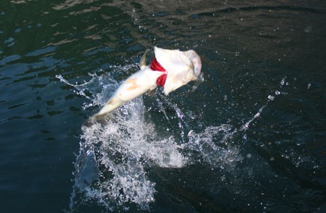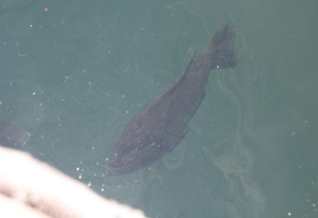 桟橋下に居る巨ギル。みんなで肉とかパンとか枝豆で釣ってみるw