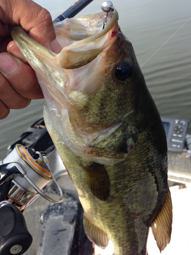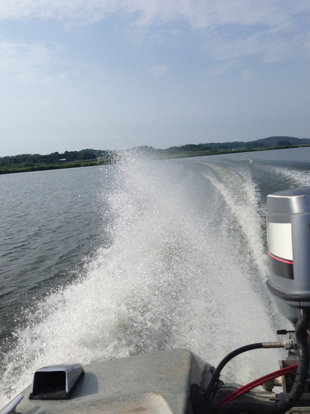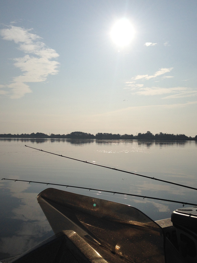 そんなわけでいい感じの太陽を浴びつつも6時半に出船。とりあえず無風なのでバズベイトから様子見。