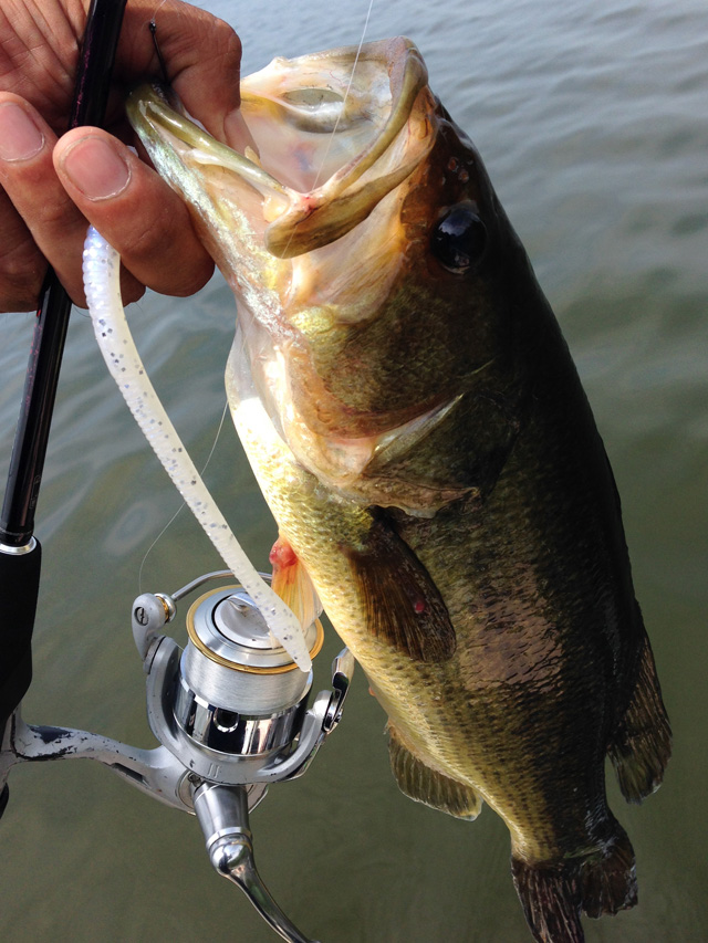 いやーーシビレル。スーパーローギアでのやりとりw 春先はスーパーローギアが無敵ですが、ハイシーズンはさすがにキツイっす。バスがこっちに向かってくる、そしてスピードが速い、こーなるとスーパーローギアでは超ゴリ巻きしなきゃならず大変!ディープクランク(トレブルフック)ならまだいいけど、重めのジグだとゴリ巻き命なので超焦りますw