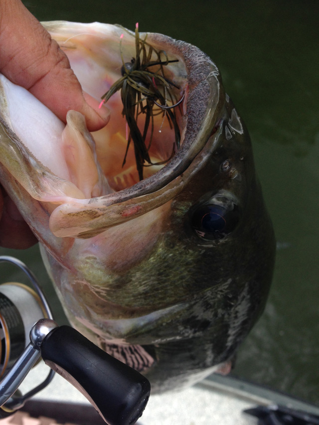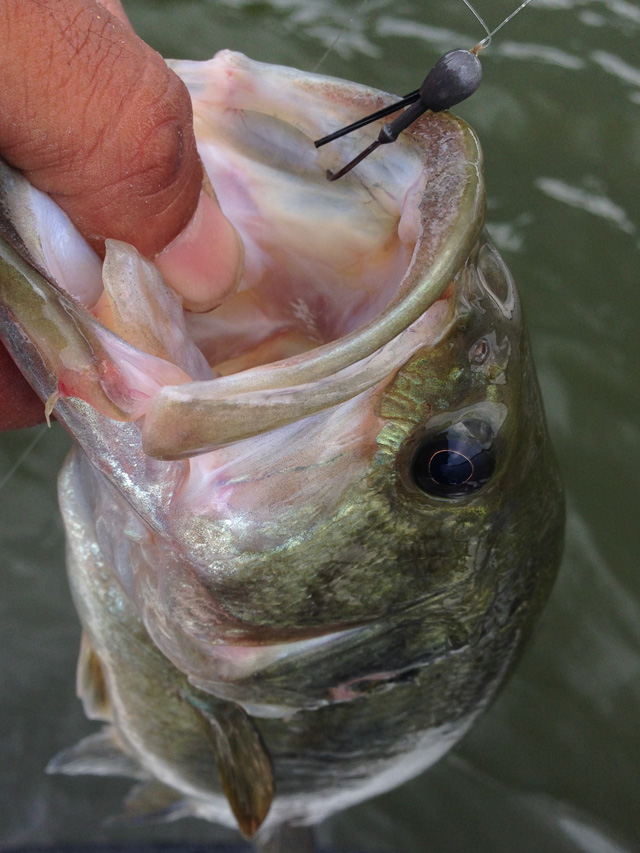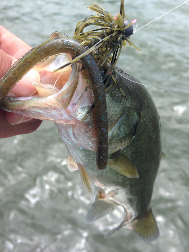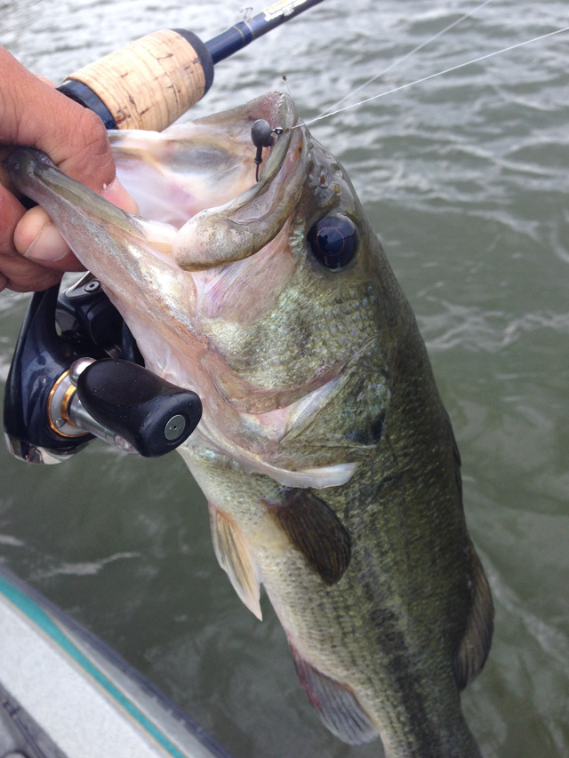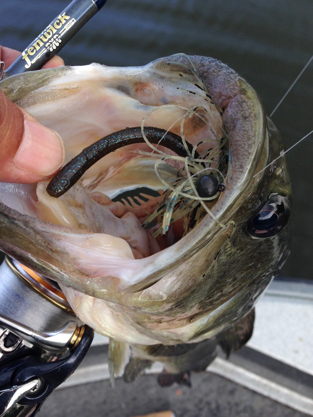 ただ、回収できても針先が潰れてたり、樹脂タンが外れたりで3個殉職。ってことで、ここからは普通のジグヘッドワッキーに。普通ってもジグヘッドはケイテックのガードがいっぱいついてるやつです。