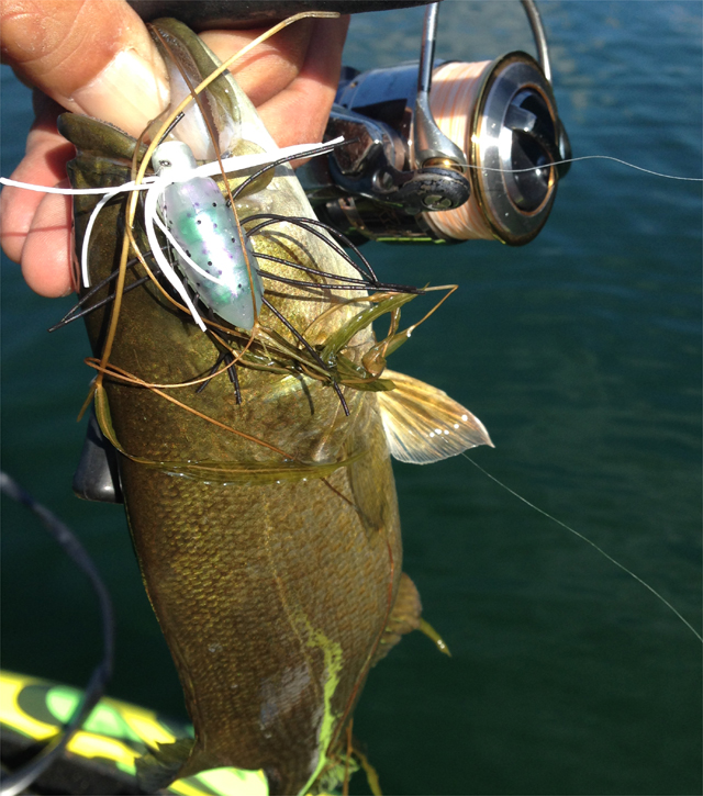 単発で沖で跳ねるのがポツポツと。でもコイ。潜った後に泡がいっぱいでる系。9割がたコイと思いつつも、その音に反応するのがバス。ってことで、直撃したら釣れたw