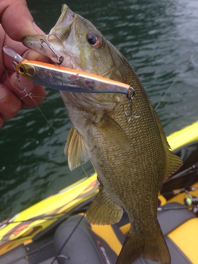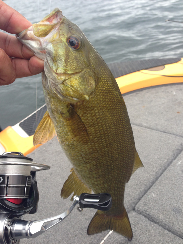 楽しい~。これだからスモールマウスは面白い。5~6mラインでショートリップミノーを襲ってくる。ラージでもなくはないけど、スモールならでは。