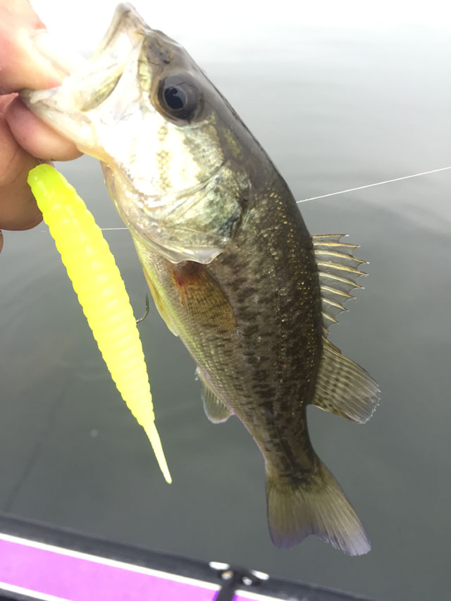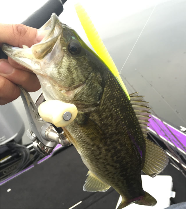 お昼過ぎ。いい感じのエビ藻パッチなエリアへ。表層は沈黙してるんで、パッチ付近に世界一釣れるワームを投入。