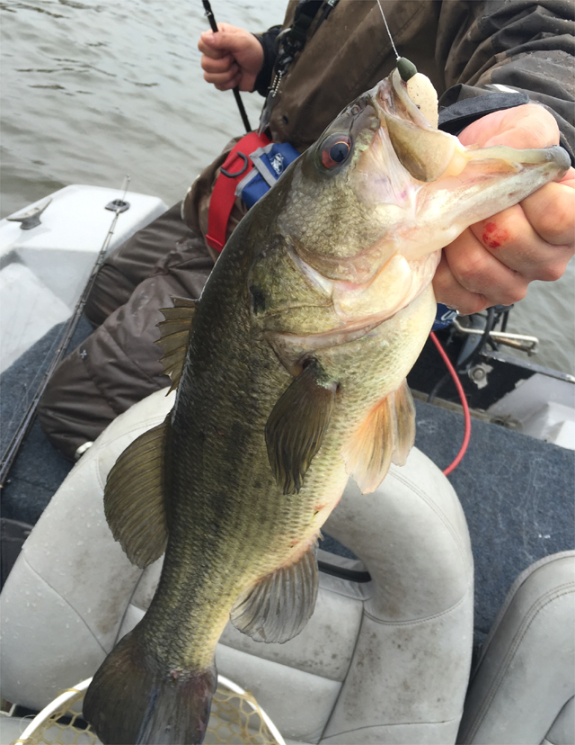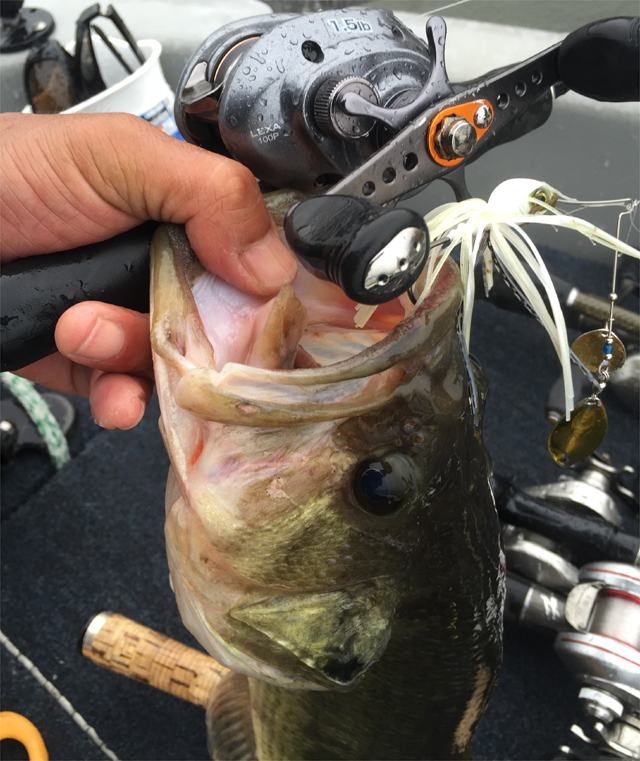 とりあえずボート屋周りの微風があたっている葉っぱエリアからスタート。それっぽいスポットで幸先よい1匹めがスピナーベイトに。