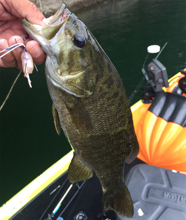 スパッスパッと左右にダートさせてピタっと一瞬止めるキビアダーの下から良型スモールが突進。からの、トィッチ一発でパックリ反転食い!キタ~。一部始終を見てたピカル君も大興奮w