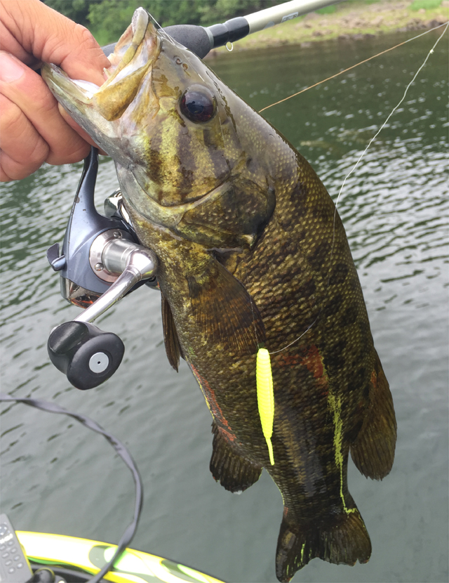 ウィードから飛び出してきたその魚、姿はラージだったけど、暴力的な強さと猛スピードで暴れる。え?スモール?ん?ラージ?どっち?っていう感じで上がってきたのはラージでした!