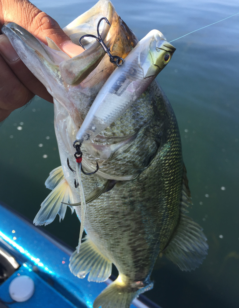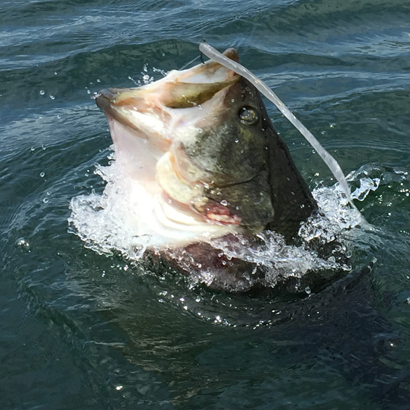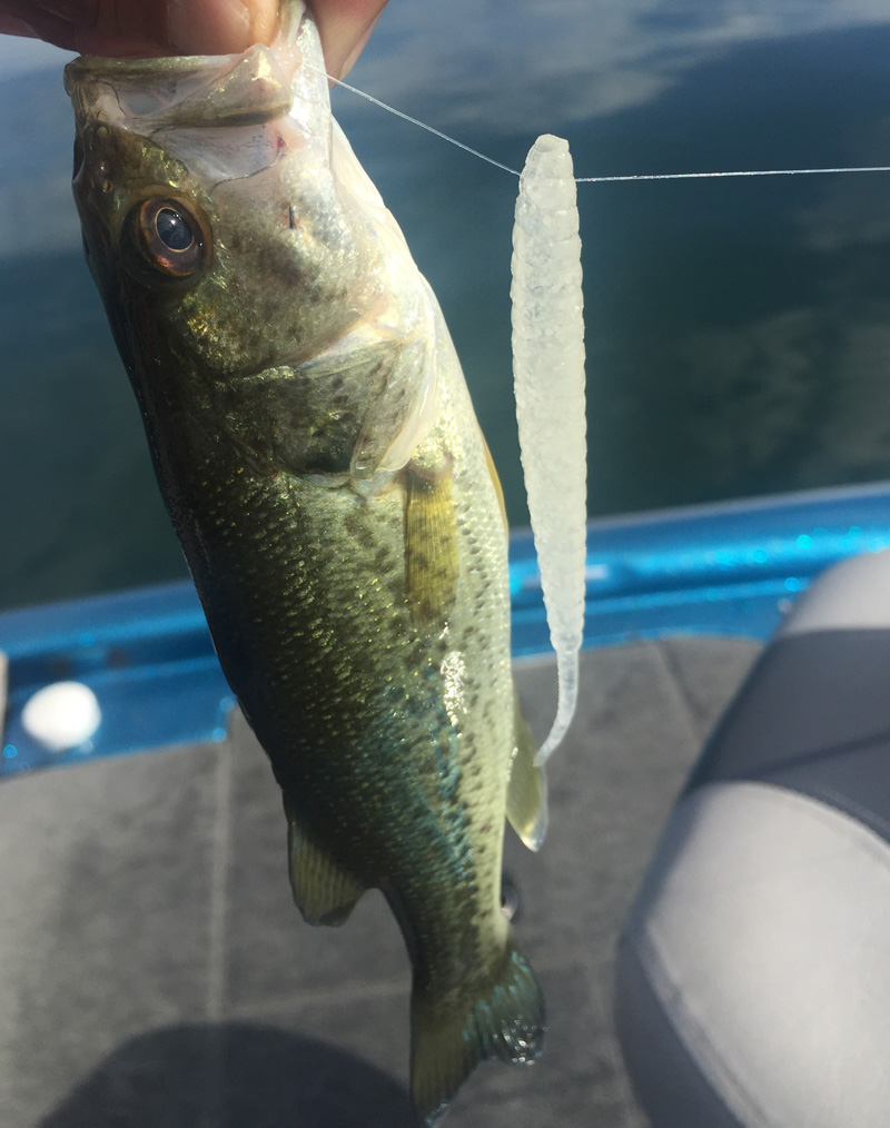 快晴すぎでトップはイマイチらしく、今度は表層ワーム系の釣り。平村さんはポンポン連発してます。が、オレには釣れないw 得意の釣りなのに。これはなにかの罠に違いないと思って平村さんの釣りを見てたら、トィッチしてまーまー沈めて食わしてた。しかもオフセットフック+アイシャッドなので、オレのセティングよりかなり沈む系。わずかな水深の違いだけど、この釣りもレンジコントロールはけっこうシビアです。