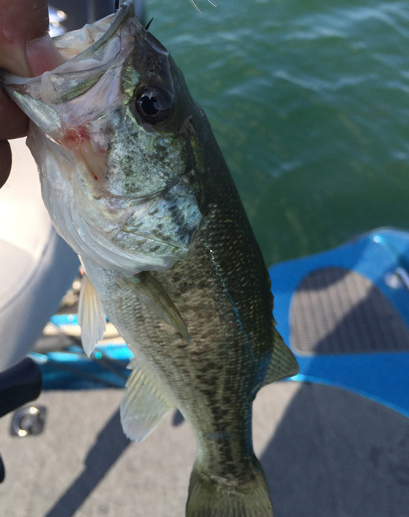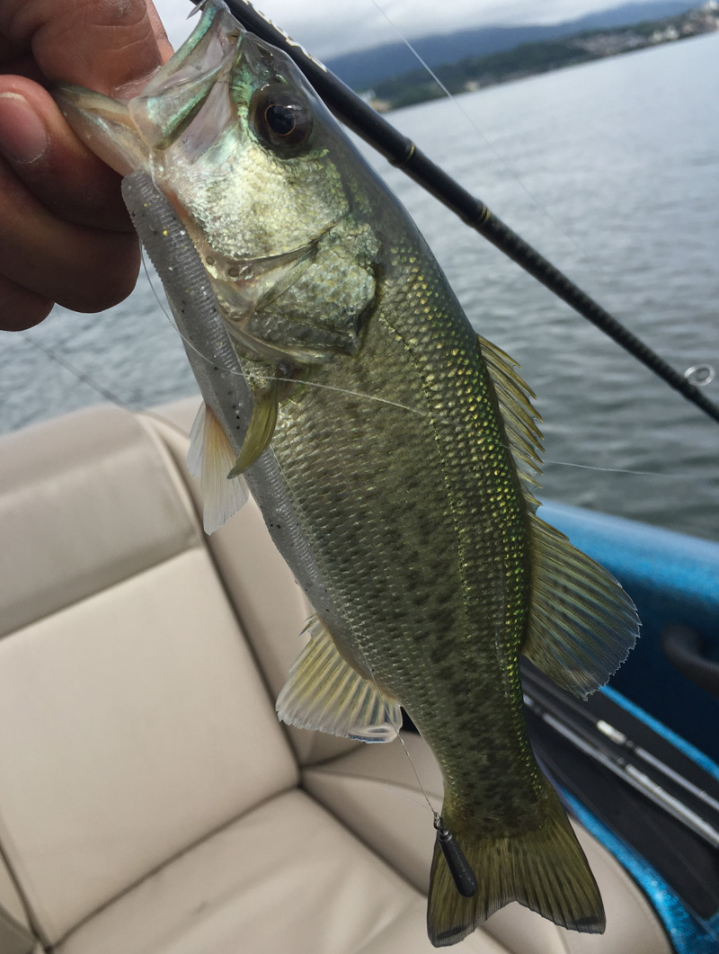 ヘビーダウンショット(ってもシンカーは3.5g)のウィードの釣り。こうやって琵琶湖で経験積んでるんだから榛名湖でもやればいいのにねオレw
