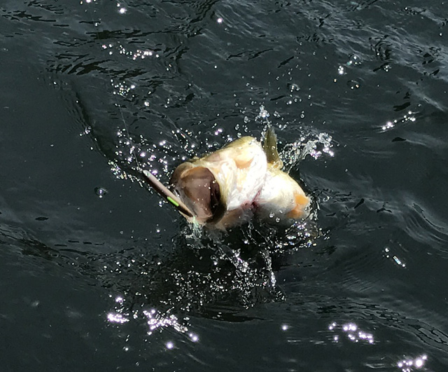 ルアーはボトムにあるけどオレの目と耳は常に周囲の水面にあります。ん?なんか怪しげな水のヨレ。んんん?おっ!なんかが水面で何かに食われた!足元にスタンバっているボイル狙いタックルで直撃!
