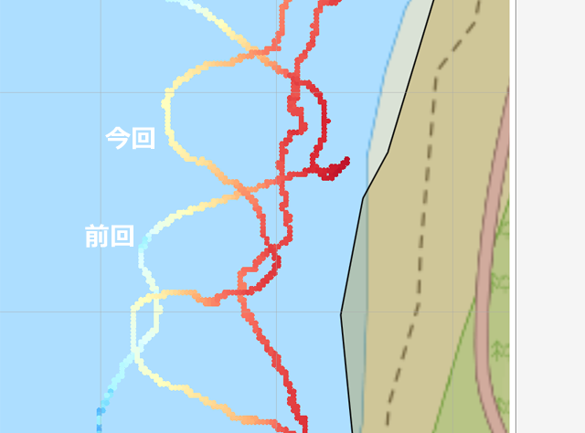 小回りが効かないボートなのでジクザクに漕ぐにしても最小回転半径がかなり大きい。なので、前回の航跡を確認しつつもクロス状にボートを進めていく感じ。
