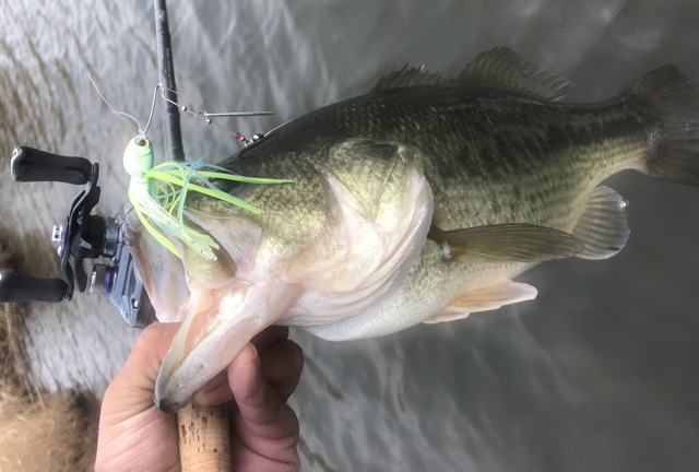 冠水ガマ枯れ根っこにメスが浮いてることが多いので、それをバジング気味の表層巻きで狙います。3/8ozでやりたいけどいい感じのカラーの手持ちがないので、1/2のハイピッチャーで無理くり表層引き。