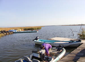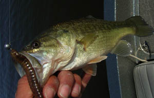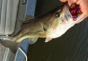 そこはボート屋北側の浚渫8mがまじかに迫った極浅のガマストレッチ。オレのボートだと底ついて行きづらいとこ。沖側から入ってみる。ボートを岸から離してキンクー8インチJHを垂直に引いてくると釣れるらしい。でも岸際で 食ったり手前で食ったりバラバラらしい。